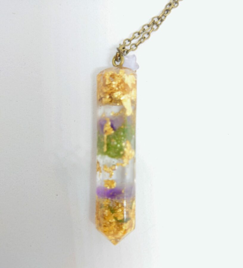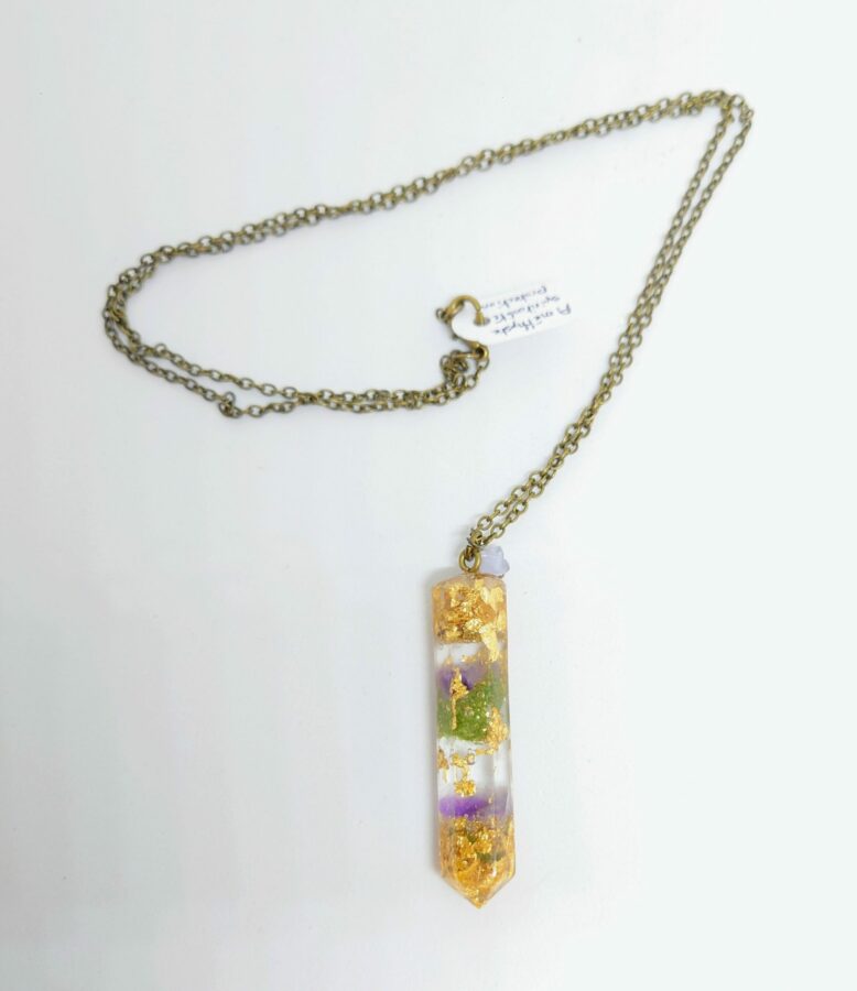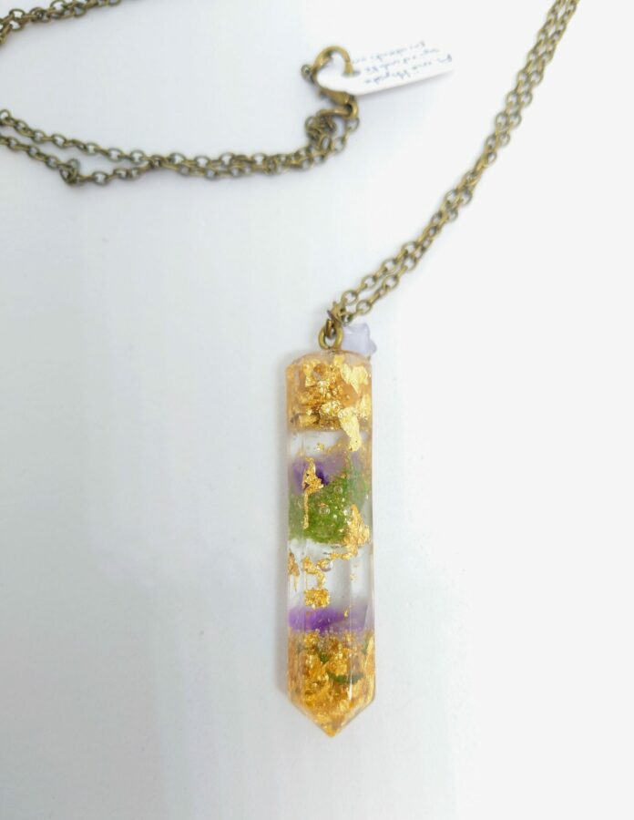 Pendule qui peut être porté en collier, réalisé en résine, feuille d’or et paillettes. Chaque fleur séchée est choisi en fonction  de son langage.