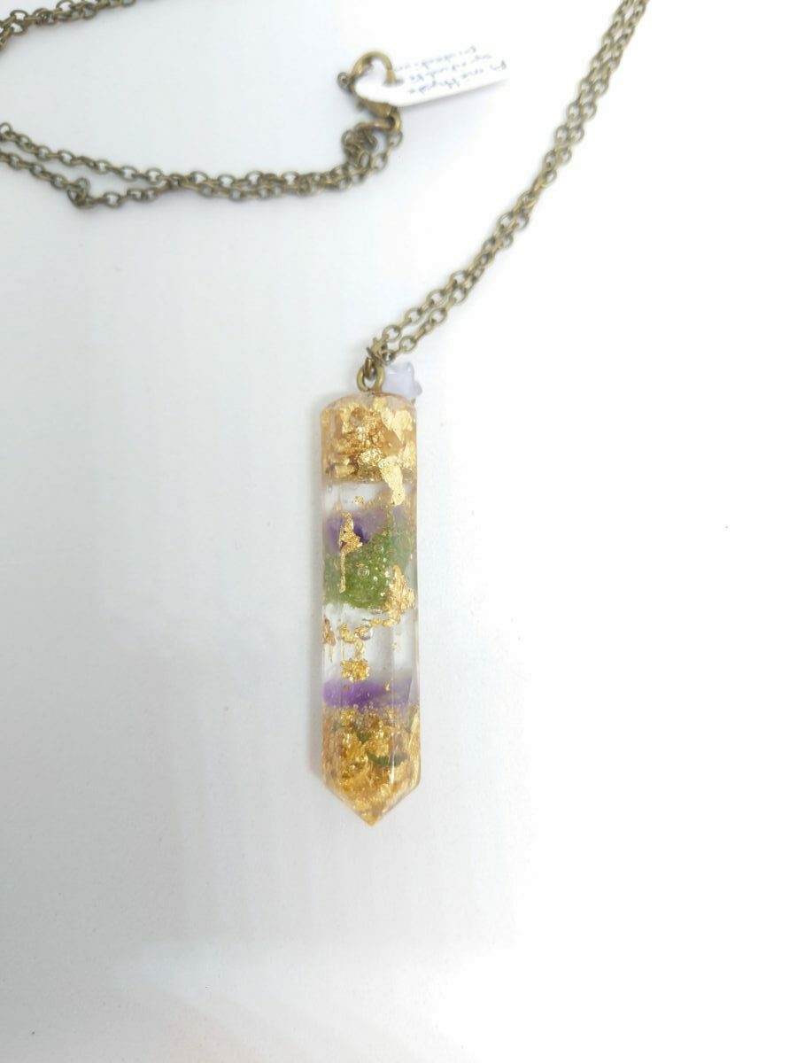 Chaque pendule est réalisé de façon artisanale dans mon atelier, chaque modèle est donc unique. Les pendules sont réalisés en résine, feuille d’or, paillettes pour refléter la lumière et fleurs séchées. Chaque fleur séchée est délicatement choisie pour sa signification. Des gemmes choisies délicatement par mes soins y sont incorporées.
