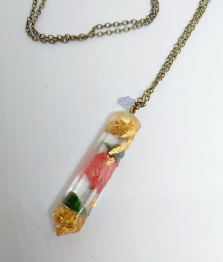 Chaque pendule est réalisé de façon artisanale dans mon atelier, chaque modèle est donc unique. Les pendules sont réalisés en résine, feuille d’or, paillettes pour refléter la lumière et fleurs séchées. Chaque fleur séchée est délicatement choisie pour sa signification. Des gemmes choisies délicatement par mes soins y sont incorporées.