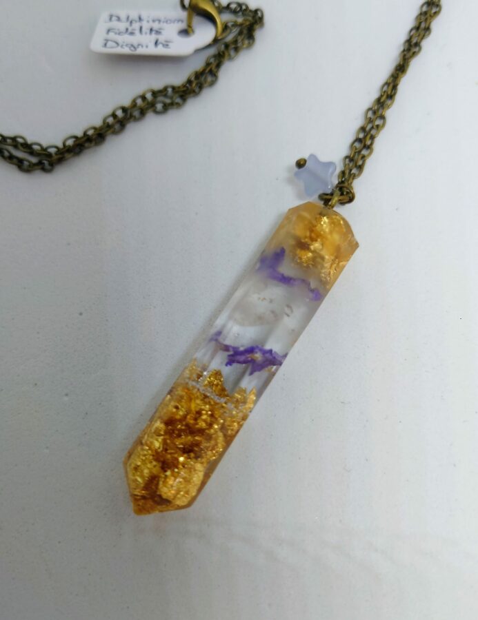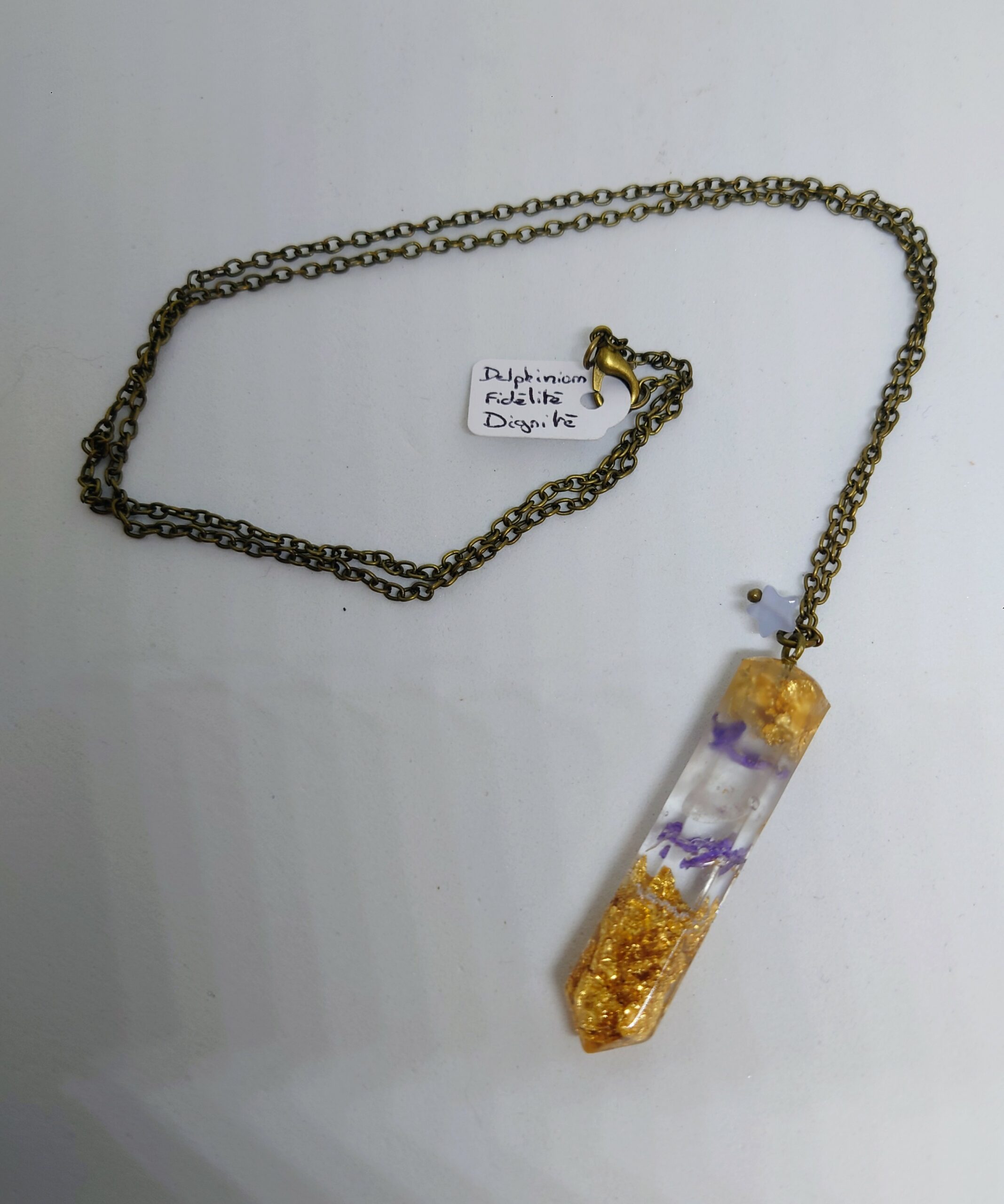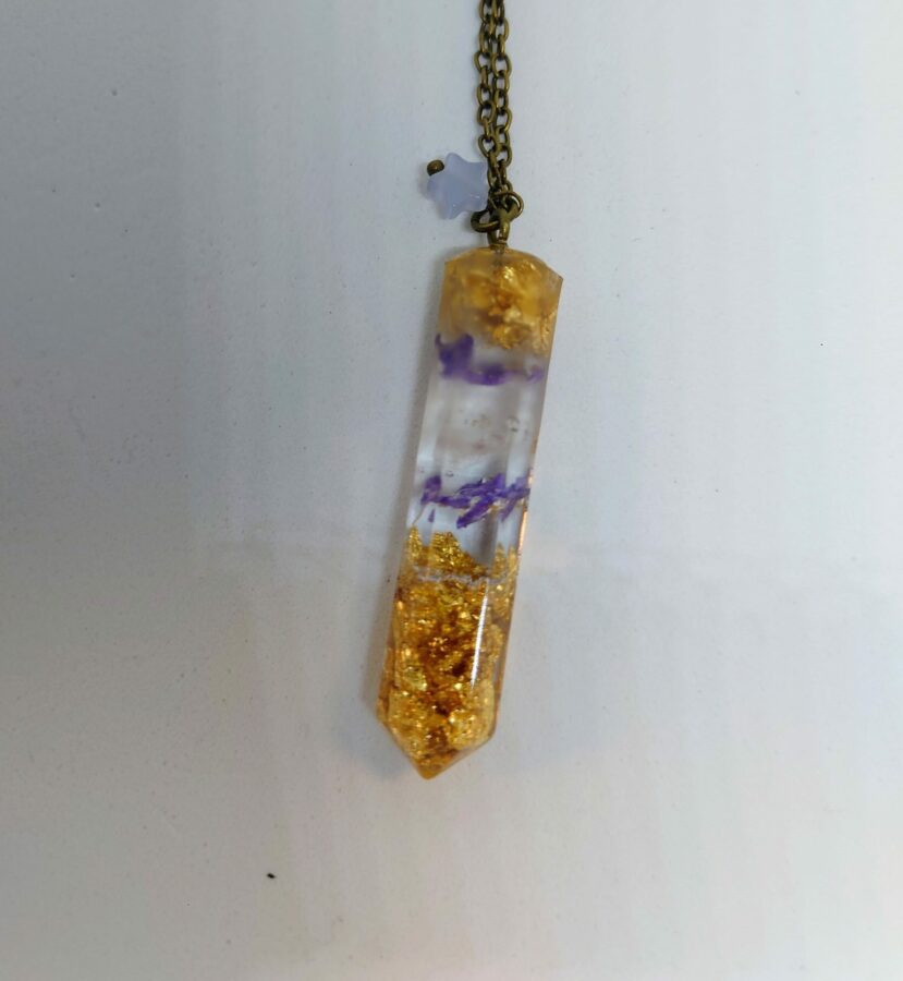 Pendule qui peut être porté en collier, réalisé en résine, feuille d’or et paillettes. Chaque fleur séchée est choisi en fonction  de son langage.