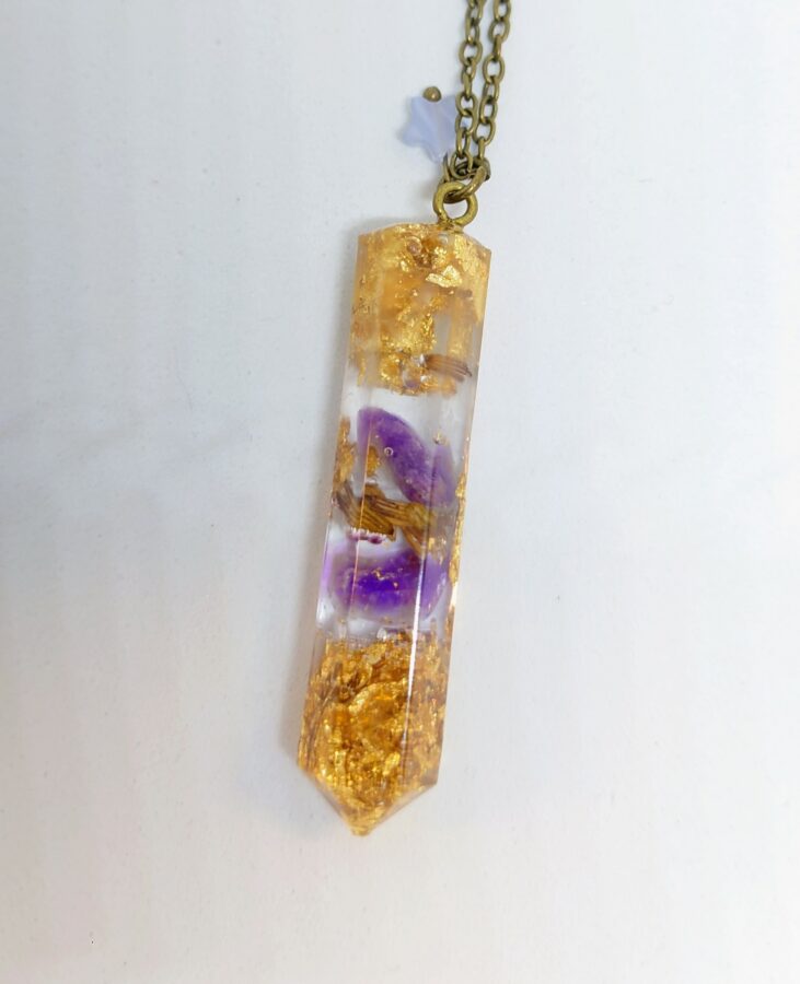 Chaque pendule est réalisé de façon artisanale dans mon atelier, chaque modèle est donc unique. Les pendules sont réalisés en résine, feuille d’or, paillettes pour refléter la lumière et fleurs séchées. Chaque fleur séchée est délicatement choisie pour sa signification. Des gemmes choisies délicatement par mes soins y sont incorporées.