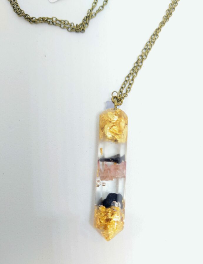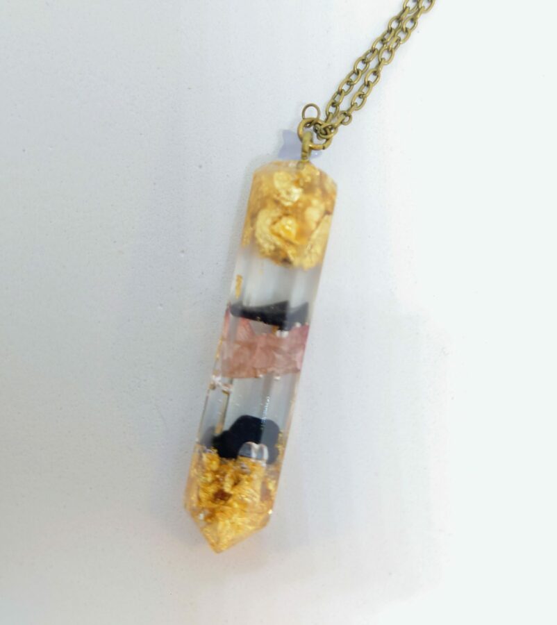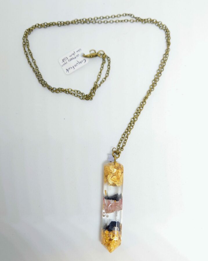 Chaque pendule est réalisé de façon artisanale dans mon atelier, chaque modèle est donc unique. Les pendules sont réalisés en résine, feuille d’or, paillettes pour refléter la lumière et fleurs séchées. Chaque fleur séchée est délicatement choisie pour sa signification. Des gemmes choisies délicatement par mes soins y sont incorporées.