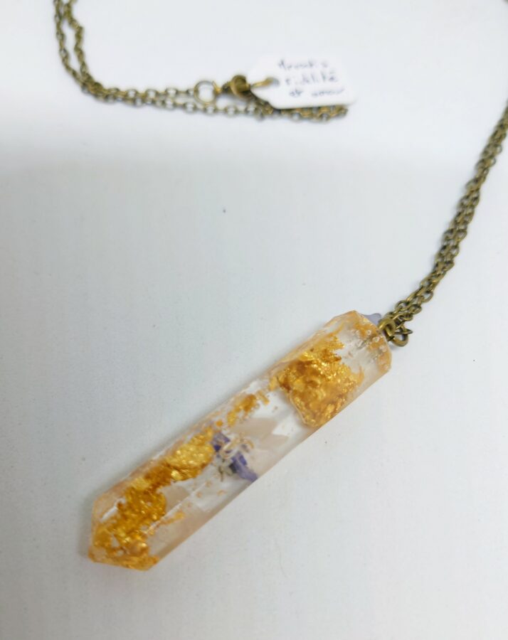 Chaque pendule est réalisé de façon artisanale dans mon atelier, chaque modèle est donc unique. Les pendules sont réalisés en résine, feuille d’or, paillettes pour refléter la lumière et fleurs séchées. Chaque fleur séchée est délicatement choisie pour sa signification. Des gemmes choisies délicatement par mes soins y sont incorporées.